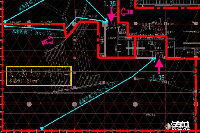 經過和設計單位仔細探究,確定當一個防火分區僅有 1 部剪刀樓梯作為安全出口的時候,需要滿足疏散距離不超過 10 m 的要求,現防火分區圖中,每一個防火分區都不止 1 部剪刀樓梯作為安全出口,因此原平面滿足《建規》第 5. 5. 17 條的規定。