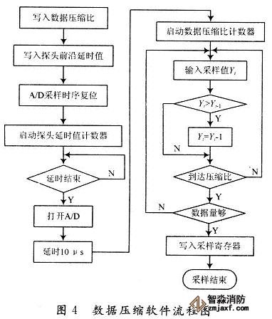 數(shù)據(jù)壓縮處理是對射頻信號高速采樣后進行前置處理的重要環(huán)節(jié)之一,需要在保持超聲回波信號基本特征前提下對采樣數(shù)據(jù)進行在線壓縮,而且要求壓縮后的數(shù)據(jù)與原始采樣信號的包絡(luò)相吻合。為此,在每次壓縮過程中,只取采樣所得的最大值,而舍棄其他采樣值。FPGA將計算所得采樣數(shù)據(jù)的壓縮比、探頭前沿延時計數(shù)值等數(shù)據(jù)送入相應(yīng)的鎖存器,然后發(fā)出時序復(fù)位命令并發(fā)射,啟動探頭延時計數(shù),延時到后啟動A/D采樣,同時壓縮比計數(shù)器開始計數(shù),在時鐘信號的控制下,每采樣一次,壓縮比計數(shù)器減1,并將當(dāng)前采樣值與前次采樣值比較,如大于則保存,否則舍棄,直至壓縮比計數(shù)到零后,得到一個有效的采樣數(shù)據(jù)。同時壓縮比計數(shù)器自動復(fù)位,重新開始計數(shù),其工作流程如圖4所示。